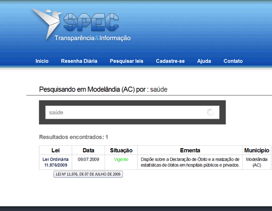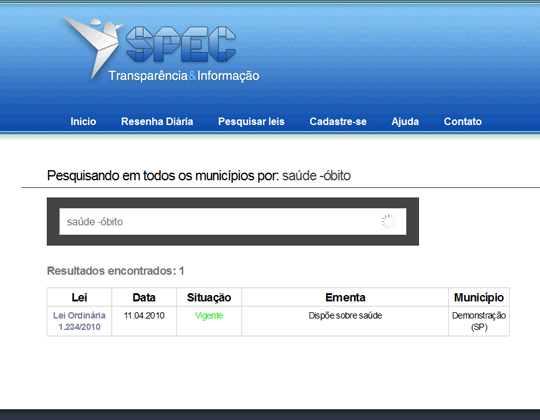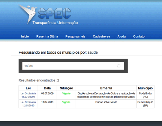 No exemplo, pesquisamos pelo termo "saúde", o qual retornou resultados de dois municípios (fictícios: "modelândia" e "demonstração").